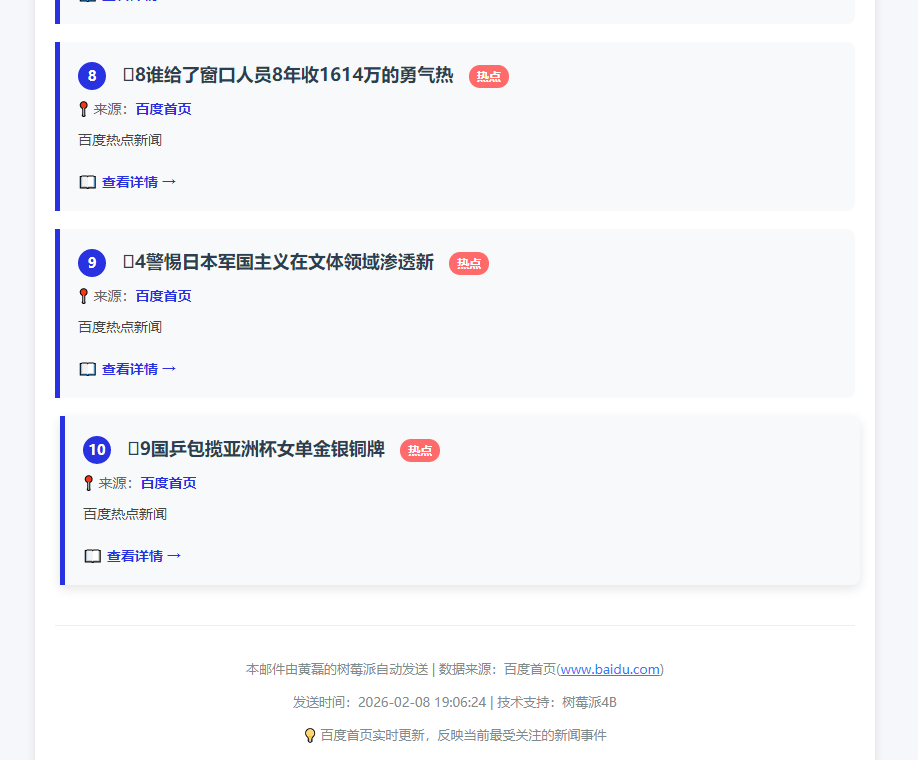 目前提取的是排名前10的热点新闻,这个数量经过实践验证,既不会信息过载,又能覆盖当天最重要的新闻事件。