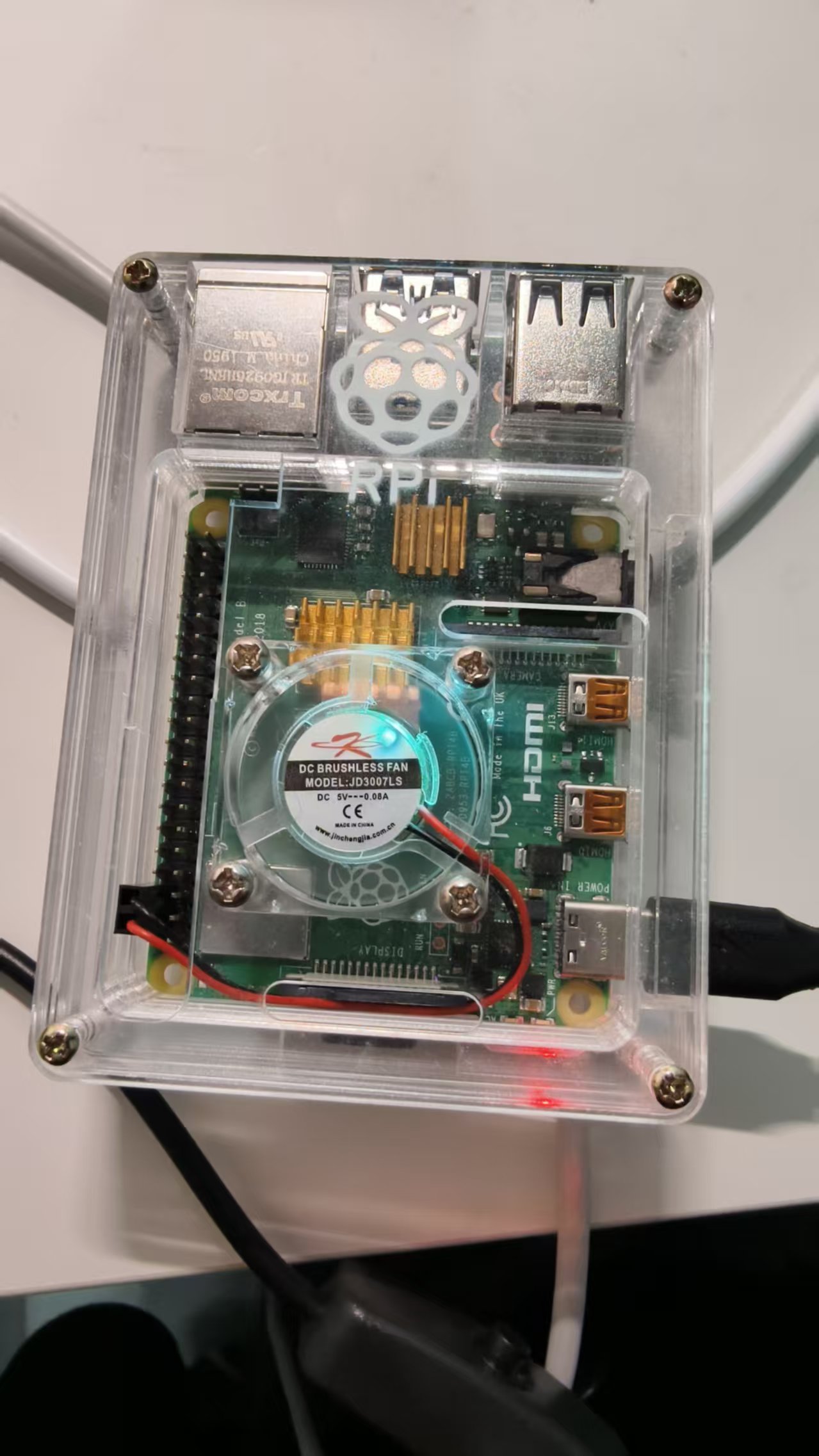 图:部署项目的树莓派4B,配备透明外壳和主动散热风扇,确保长时间稳定运行