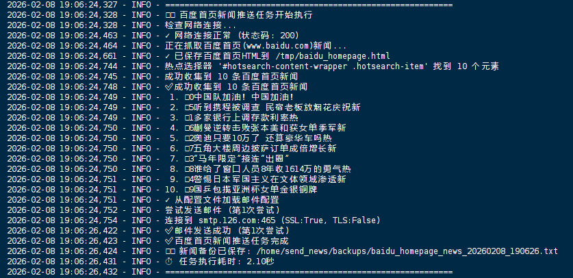 0 8 * * * cd /home/send_news && /usr/bin/python3 baidu_homepage_news.py >> /home/send_news/logs/news.log 2>&1这样的配置确保无论我是否在电脑前,都能准时收到当天的新闻摘要。通过日志重定向,所有运行记录都会保存到指定文件,方便后期查看和分析。