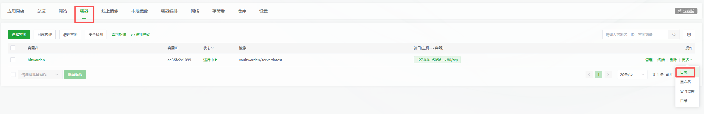 - 到宝塔面板,Docker->容器,选择你创建的bitwarden容器,选择停止,然后删除,这个删除不会丢失数据,因为数据文件夹是服务器上的目录挂载的,删除容器不会删除这个目录,当然你不放心也可以先在bitwarden上导出密码,这个我就不说了。