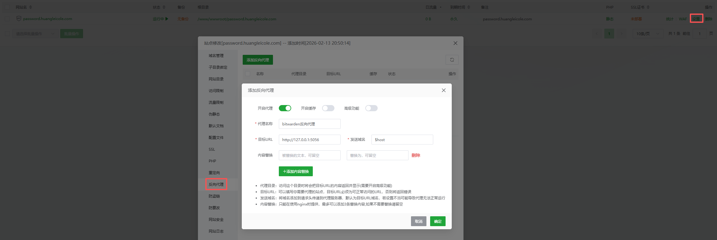 创建完站点之后,点击设置,选择反向代理,添加反向代理,参考图示填写。