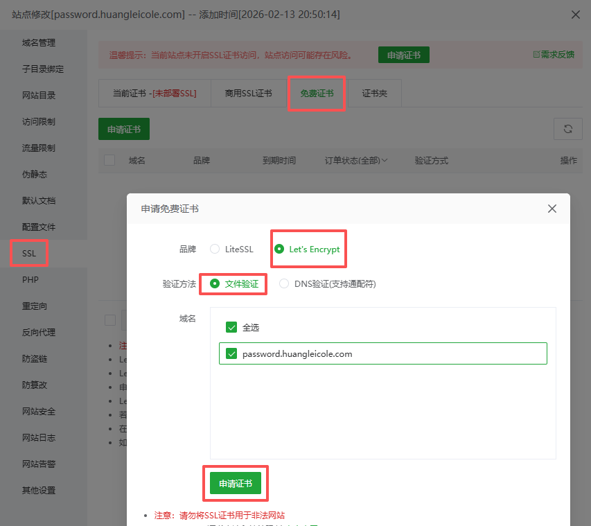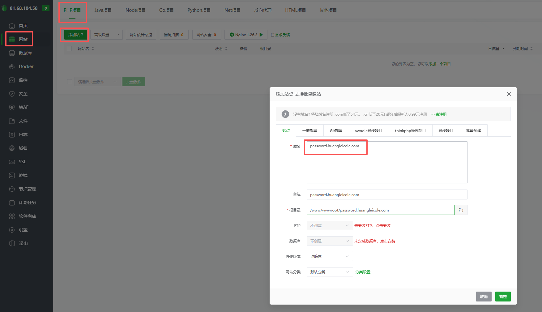 这样服务就启动好了,但是为了安全和功能完整性,我们要给这个服务设置反向代理到指定的域名,而且这个域名要配置ssl证书(后面我会讲),之前我就试验过,如果不配置的话,虽然能查看密码,但是新增,修改和删除密码都会不起效,具体的原因我也不知道为啥。如图所示创建php站点。输入域名,这个域名的解析要解析到你这台服务器的ip地址。