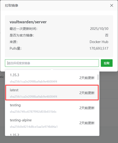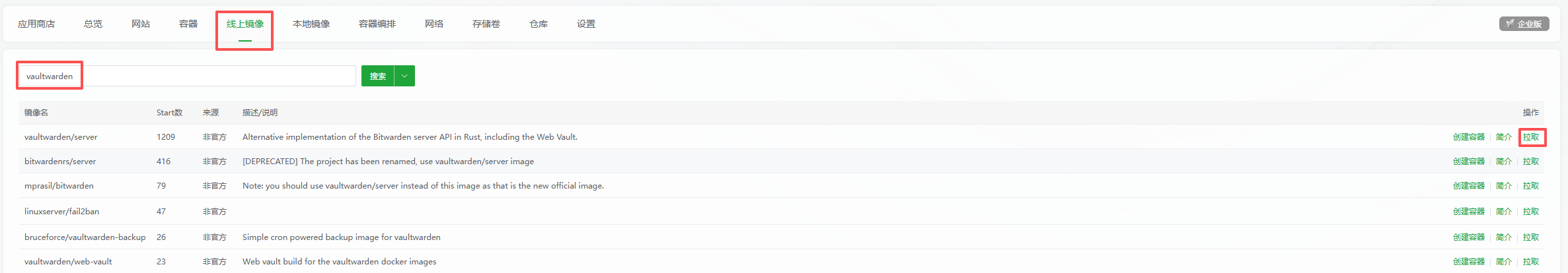 安装好之后,我们选择线上镜像,然后在输入框输入vaultwarden搜索镜像,选择第一个进行拉取。这里说明一下为啥要输入这个。因为bitwarden的docker镜像有两种,