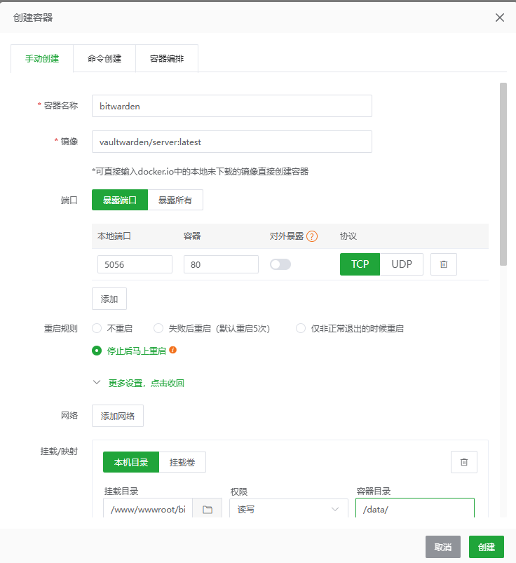 在进行接下来的步骤之前,先在/www/wwwroot/下面创建bitwarden_data文件夹,这个后面用于挂载容器的目录
